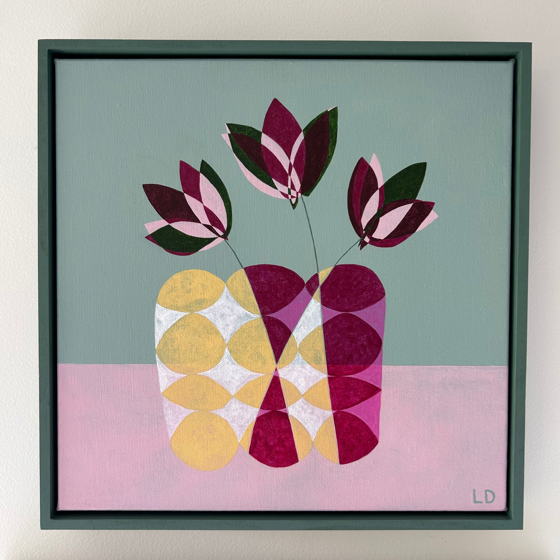 An original, varnished, acrylic painting on canvas in feature greens, pinks and yellow. 'On The Rocks' was the first in my mini series 'Top Shelf' which is inspired by the good old spirit glass.